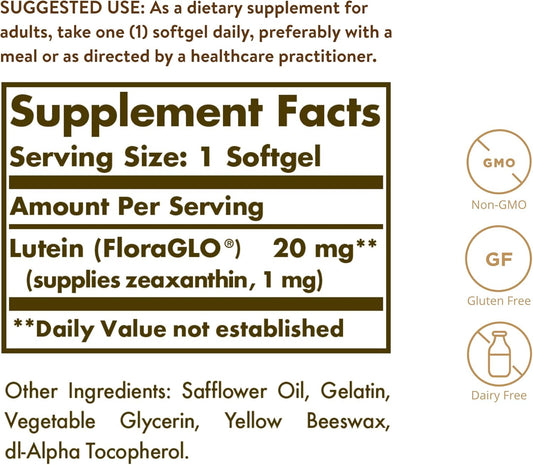 Solgar Lutein Softgels 20mg, 60 Count - Promotes Eye Health, Blue-Light Protection - FloraGLO Lutein Formula - Non-GMO, Gluten Free, Dairy Free - 60 Servings