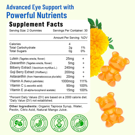 Sugar-Free Mango Flavored Eye Vitamins with Lutein, Zeaxanthin, Bilberry, & Astaxanthin - 60 Gummies for Blue Light, Visual Function, & Macular Health