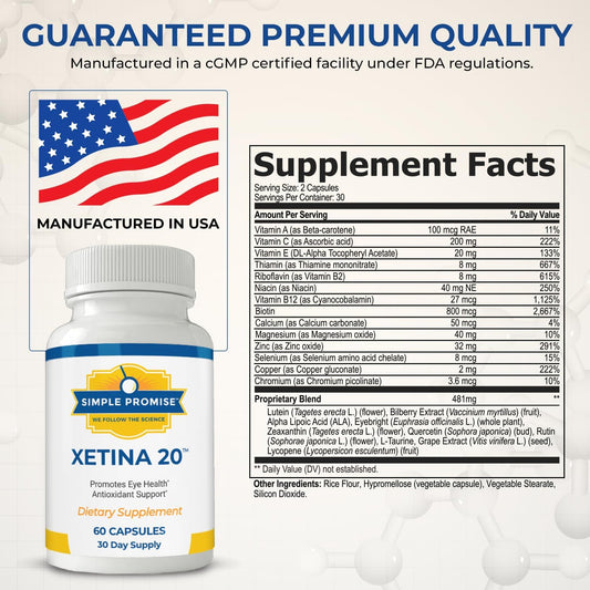 Xetina 20™ Lutein and Zeaxanthin Supplements - Eye Health Support with Vitamins E, Eyebright, Zinc - 60 Capsules