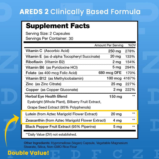 Eye Health Supplement with Zinc, Vitamins C & E, Lutein, Zeaxanthin - 60 Capsules, Non-GMO Vegan Formula for Adults