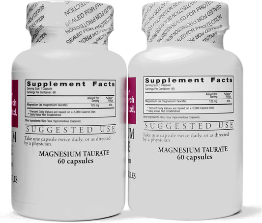 Magnesium Taurate Supplement for Cardiovascular Health - 125mg Elemental Magnesium - 120 Capsules (60 X 2)