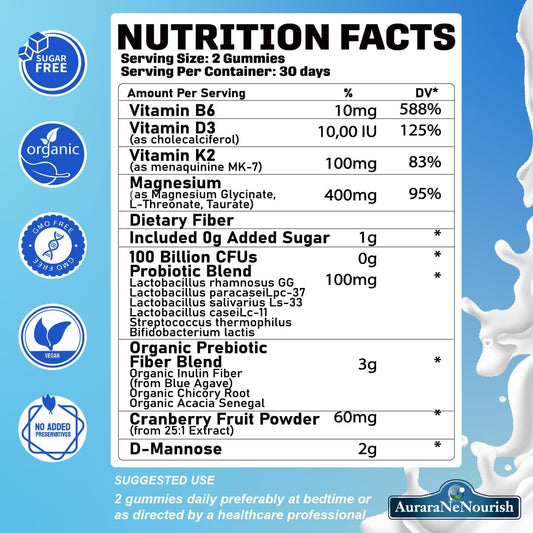 Sugar-Free Magnesium Gummies with Probiotic & Fiber - 2 Pack, 400mg Magnesium Glycinate, L-Threonate, Taurate - Chewable Gummies for Calm, Sleep, Brain, Digestion, Gut Health - VIT D3 K2 B6 Included