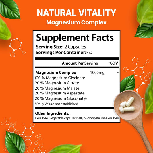 120 Veggie Capsules of 5-in-1 Magnesium Glycinate Citrate Malate Aspartate Gluconate, 1000mg, Gluten-Free, Non-GMO - 2 Month Supply