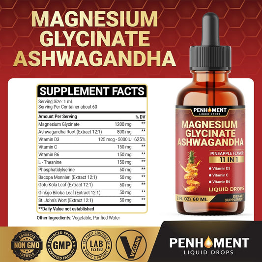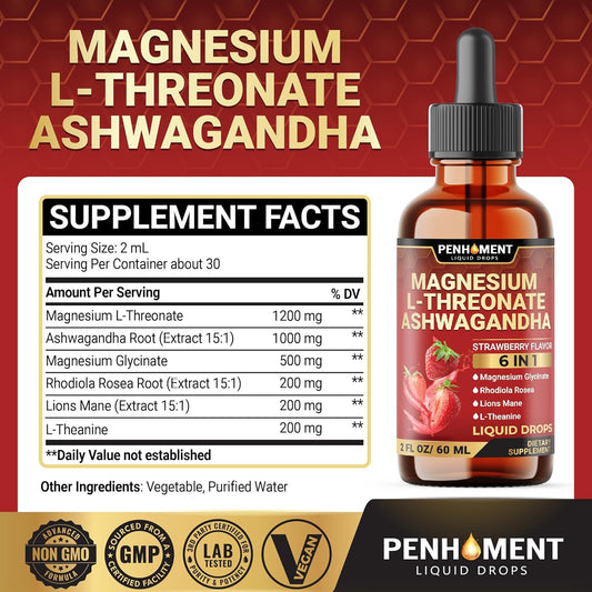 Penhoment 5in1 Magnesium Glycinate Liquid Drops with Ashwagadha Extract, Rhodiola Rosea, Sea Moss - Brain and Immune Support - 30-Day Supply - Strawberry Flavor - 2 Fl Oz