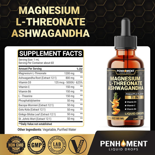 11-in-1 Magnesium L-Threonate Liquid Drops with Ashwagandha and Vitamins for Brain Support - Pineapple Flavor - 2 FL OZ - 2-Month Supply