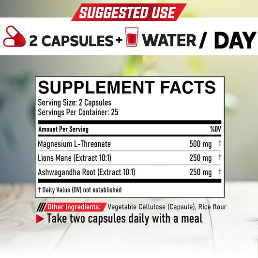Advanced Magnesium L-Threonate Supplement - 2 Packs, 50 Capsules with Lions Mane & Ashwagandha Root - 1000Mg Per Serving