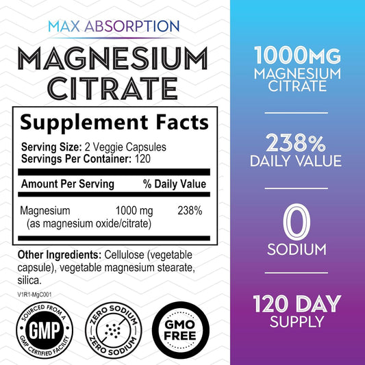High Absorption Nature's Peak Magnesium Citrate 1000mg Supplement - Muscle, Bone, Nerve & Heart Support - 240 Capsules