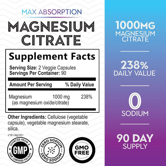 High Absorption Nature's Peak Magnesium Citrate Supplement 1000mg - Supports Muscle, Bone, Nerve & Heart Health - Non-GMO Formula - 180 Capsules