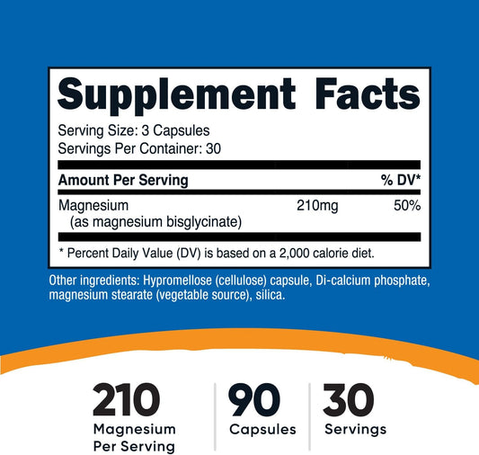 Highly Absorbable Magnesium Glycinate Capsules - 90 Capsules, 210 mg Per Serving - Nutricost Magnesium Supplement