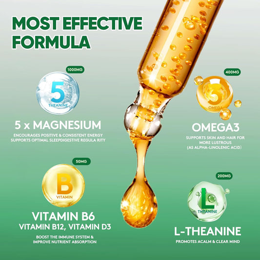 1500mg Magnesium Glycinate Liquid Drops with Vitamin B6, D3, L-Theanine, Omega-3 - Supports Night, Muscle, Bone, Mood - Strawberry Flavor - 2 Fl Oz Bottle