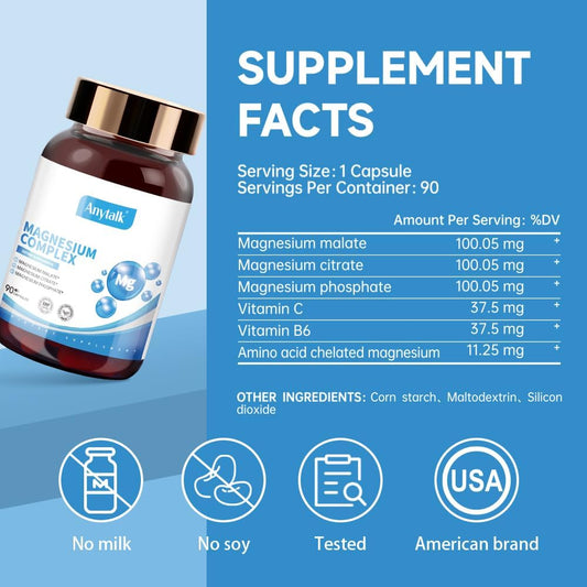 750mg Magnesium Complex Supplement - 90 Capsules, Vegetarian & Non-GMO - Gluten Free