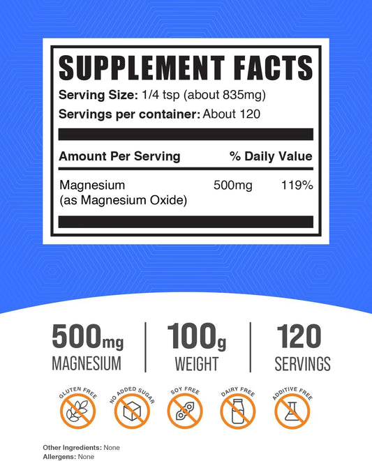 BulkSupplements.com Magnesium Oxide Powder - 500mg Magnesium Supplement, Gluten Free - 100g (3.5 oz) (1 Pack)