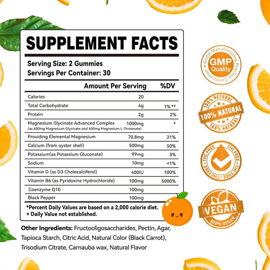 Sugar-Free Magnesium Glycinate Gummies - Potent 1000mg Supplement for Mood, Sleep, and Calm - With Vitamin D, B6, CoQ10 - 60 Orange Gummies