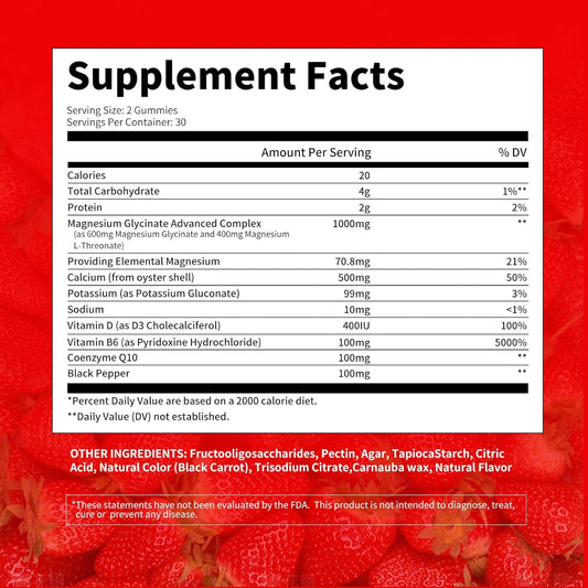 Sugar Free Magnesium Glycinate Gummies with Vitamin D, B6, CoQ10 for Calm Mood & Sleep - 60 Strawberry Gummies