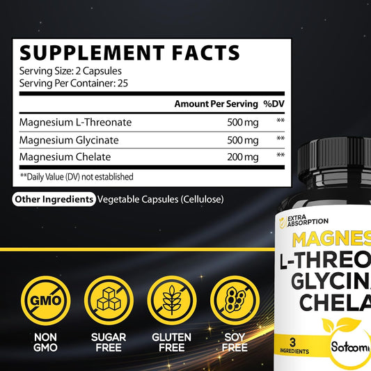 1200mg Magnesium L-Threonate Supplement with Glycinate & Chelate - 2 Packs of 50 Capsules