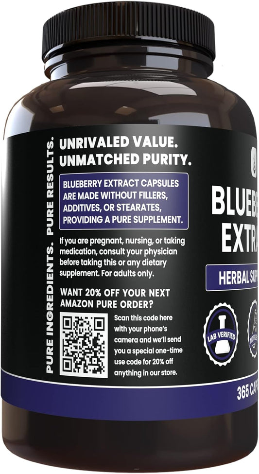 365 Capsules of Lab Verified Blueberry Extract, No Magnesium or Rice Fillers, Pure Original Ingredients