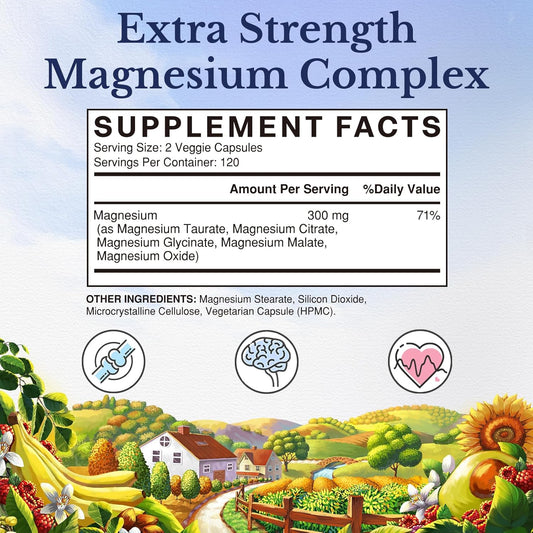 Magnesium Complex Supplement 300mg | Citrate Glycinate Taurate Malate | Non-GMO, Gluten-Free | 240 Capsules for Bone Muscle Brain Heart