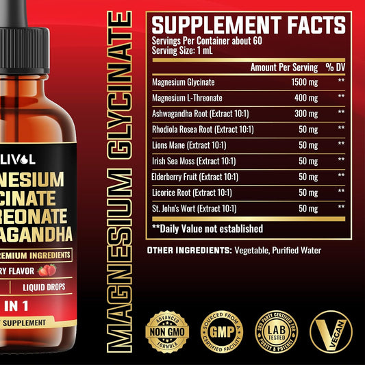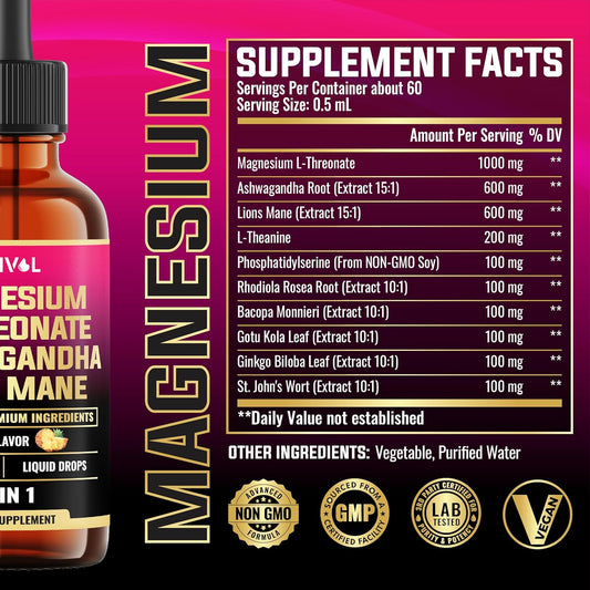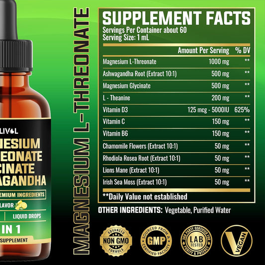 MILIVOL 10-in-1 Magnesium L-Threonate Liquid Drops with Ashwagandha and Essential Vitamins - 2 Fl Oz - Lemon Flavor