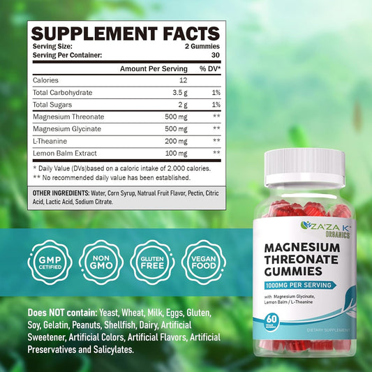 Organic Magnesium Threonate Gummies with L-Theanine & Lemon Balm - 500mg, Brain Health Supplement for Kids & Adults - 60 Count