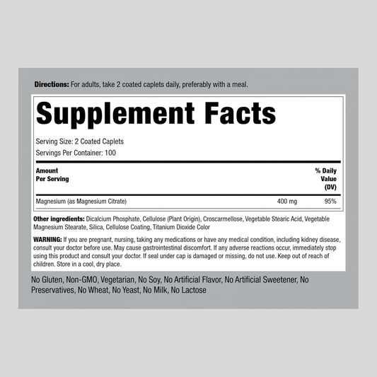 400 mg Magnesium Citrate Caplets - 200 Count | Vegetarian, Non-GMO, Gluten Free Supplement by Piping Rock