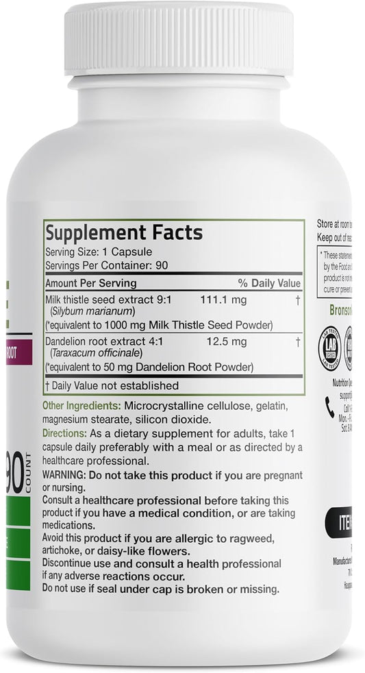 Bronson Liver Health Support Capsules with Milk Thistle, Silymarin, Marianum, and Dandelion Root - Antioxidant and Detox Formula, 90 Count