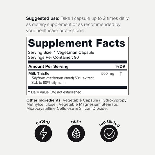 Highly Concentrated Milk Thistle Extract Capsules - 90 Count - 80% Silymarin - Ultra Potent 50:1 - Lab Tested