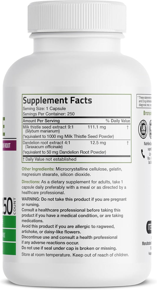 Liver Health Support: Bronson Milk Thistle & Dandelion Root Supplement - Antioxidant & Detox Support, 250 Capsules