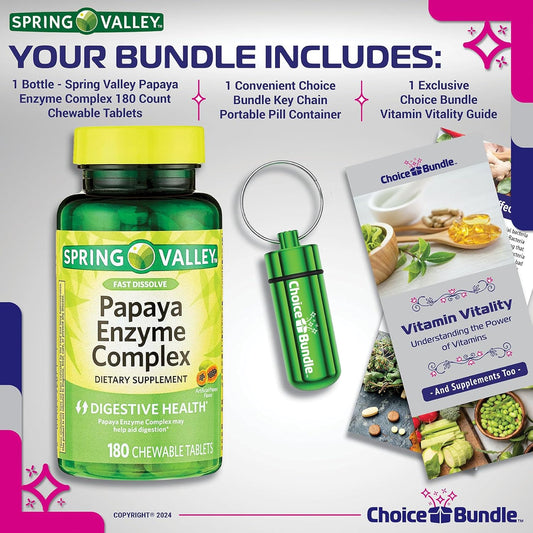 Spring Valley Papaya Enzyme Complex Chewable Tablets Dietary Supplement 180 Ct Bundle with Vitamin Guide and Pill Container - 3 Items in Total!