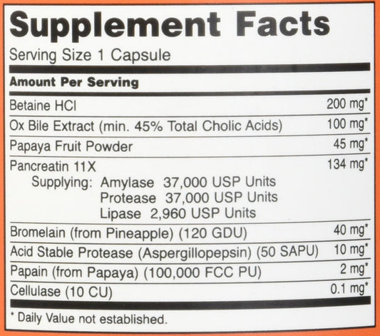 Digestive Enzyme Supplement with Mycozyme, Pancreatin, Papain, Acid Stable Protease, Betaine HCl, and Iron Bile Salts for Daily Digestive Support