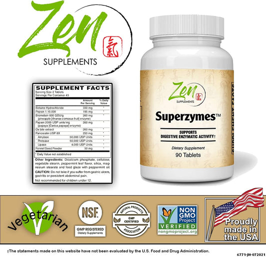 Zen Supplements Superzymes Multi-Enzyme Formula with Pepsin, Bromelain, Papain, Pancreatin, and Betaine HCL - 90 Tablets