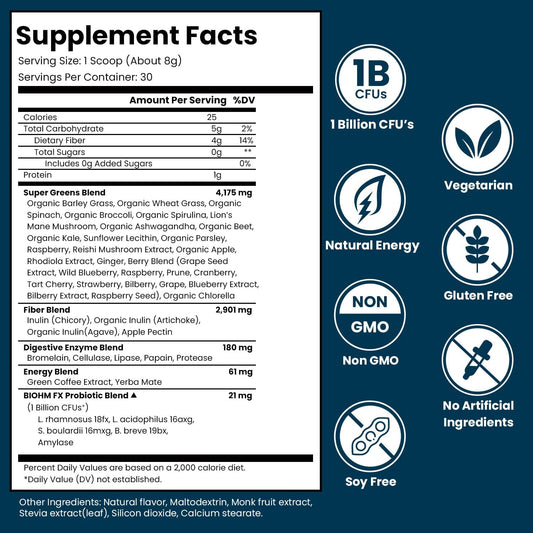 30 Servings of BIOHM Super Greens Clean Energy with Probiotics, Super Greens Superfood, 34 Natural Extracts - All Natural, Non-GMO Energy Boost
