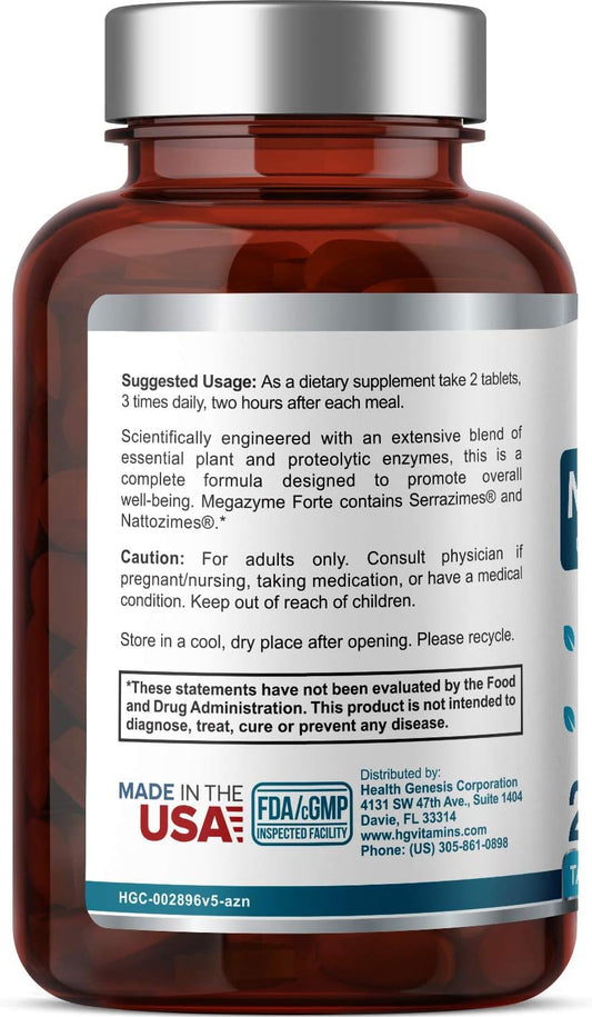 Natural Plant Proteolytic Enzymes for Digestive & Immune Support - Health Genesis Megazyme Forte 200 Tablets with Nattozimes & Serrazimes
