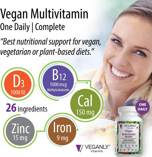 VEGANLY Vitamins One-Daily Vegan Multivitamin - 90 Veg Tablets, High Potency B12 & D3, 26 Essentials for Plant-Based Diets.