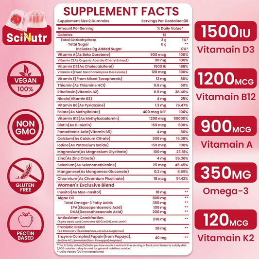 Sugar-Free Women's Multivitamin Gummies with Prebiotics, Omega-3, CoQ10, and Essential Vitamins for Heart, Brain, Gut, Energy, and Immune Support