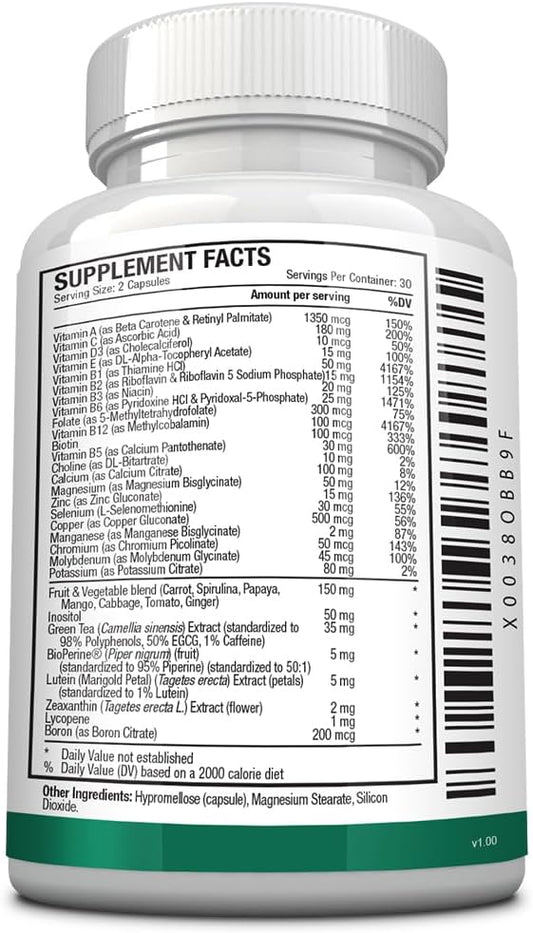 High-Quality Multi-Vitamin with B-Vitamins, Green Tea, Lutein, Lycopene, Zeaxanthin, BioPerine - 60 Capsules