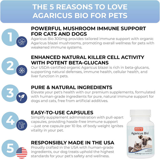 Agaricus Bio Superfood Supplement for Dogs and Cats - Boost Immune Defense & Energy, Antioxidant Mushroom Powder - 60 caps