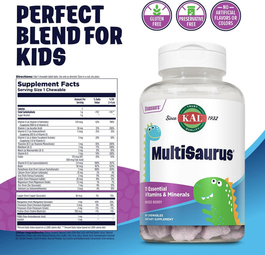 Delicious Mixed Berry Flavored Dinosaur-Shaped Kids Chewable Multivitamins, Gluten and Preservative Free, 90 Servings