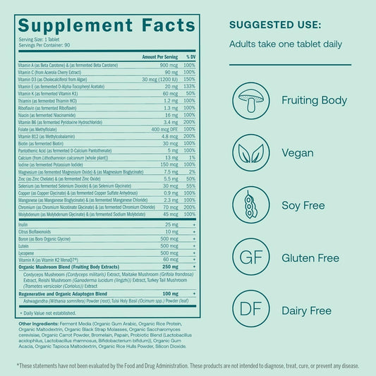 Men's Multivitamin with Fermented Minerals, Organic Adaptogens & Mushrooms for Immune & Heart Health - 90 Vegan Tablets