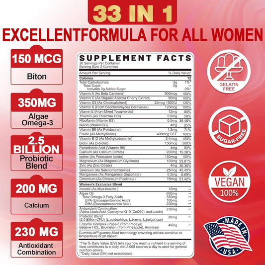 Sugar-Free Womens Multivitamin Gummies with Omega-3, Enzymes, Probiotics, and Essential Nutrients for Skin, Hair Growth, and Overall Health