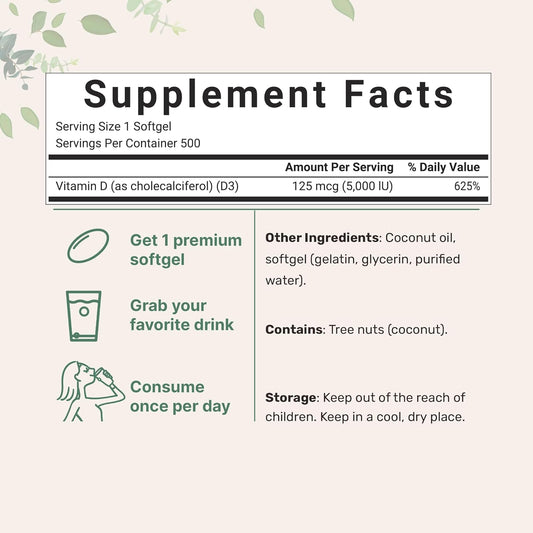 500 Softgels of Micro Ingredients Vitamin D3 5,000 IU with Virgin Coconut Oil for Enhanced Absorption | Cholecalciferol for Bone, Immune, & Heart Health | Supports Calcium Absorption