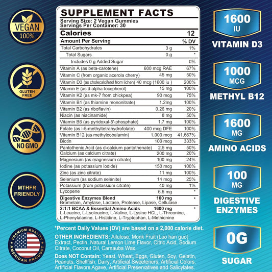 Men's Methylated Multivitamin Gummies with BCAA, Zinc, Vitamins A, C, D3, E, K2, B6, B12, Biotin, Calcium, Magnesium, Lycopene - Energy, Muscle, Immunity - 60 Count Vegan Supplement