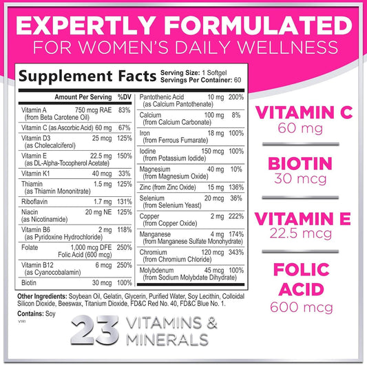 Complete Women's Multivitamin - Daily Energy & Immune Support - 60 Softgels - Vitamin A, B6, B12, C, D, Biotin, Folate, Iron, Zinc - Gluten-Free