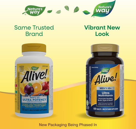 Alive! Men’s 50+ Ultra Multivitamin with High Potency Formula, Supports Brain, Eyes & Heart, Methylated B12, Gluten-Free - 150 Tablets
