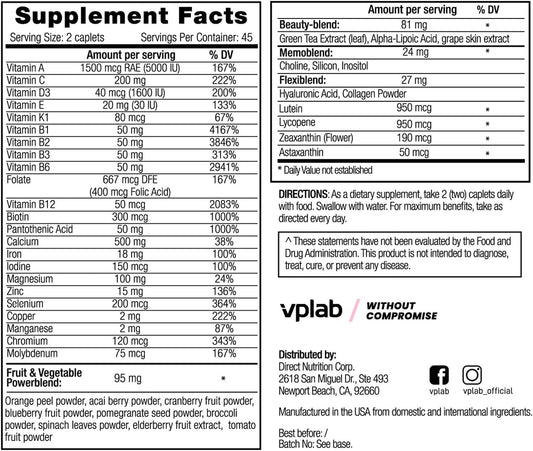 VPLab Ultra Women's Multivitamin: Hair, Skin, Nails Supplement with Biotin, Iron, Vitamin B, D, C, Zinc, Folate - 90 Caplets