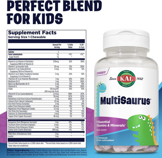 Mixed Berry KAL MultiSaurus Kids Chewable Multivitamins - 60 Dinosaur-Shaped Chewables with 11 Essential Vitamins and Minerals for Children, Gluten & Preservative Free