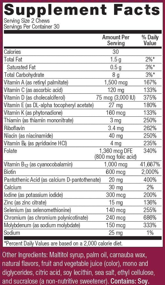 Chewable Bariatric Multivitamin Soft Chews with Folic Acid & Vitamin D3 - Black Grape Flavor - 60 Count