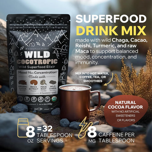 Organic Cocotropic Superfood Mushroom Hot Chocolate Mix - 16 oz (Pack of 2) | Non-GMO, Vegan, Gluten Free - Raw Cacao, Reishi, Chaga, Maca, Turmeric - Mood Boosting BlendVendor:Wild FoodsRegular price $208.28 AUDRegular priceUnit price / per-