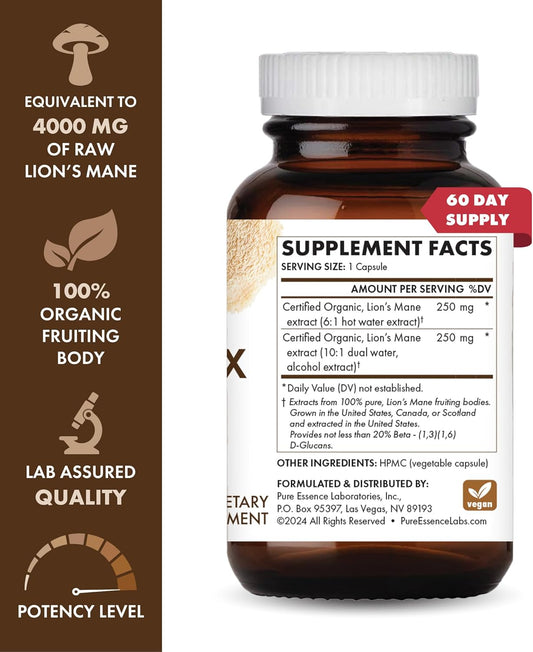 Organic Lion's Mane Brain Support Capsules - Max Strength Cognitive Performance & Mental Clarity - 60ct