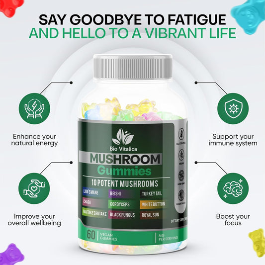 BioVitalica Mushroom Gummies for Adults - Lions Mane & 10 Blend Mushrooms Complex - Reishi, Chaga, Cordyceps, Turkey Tail, & More - Parental Supplement