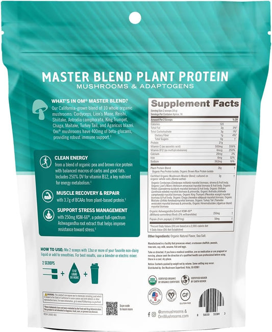 OM Mushroom Superfood Master Blend Plant-Based Protein Powder - 17.07 oz, 16 Servings, Unsweetened Original Flavor
